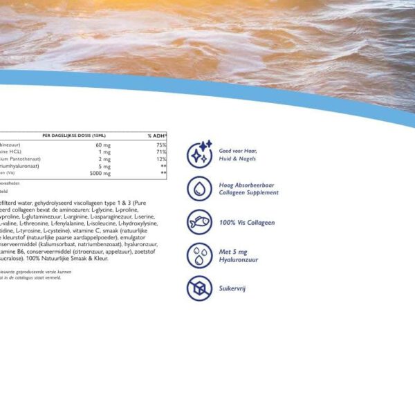 is een hoogwaardig vloeibaar collageensupplement met puur gehydrolyseerd viscollageen type 1 & 3. Dankzij de snelle opname ondersteunt dit supplement de huid, het haar, de nagels en het bindweefsel van binnenuit. De vloeibare formule is bovendien verrijkt met vitamine C, vitamine B5, vitamine B6 en hyaluronzuur voor extra ondersteuning van hydratatie, stevigheid en collageenvorming.